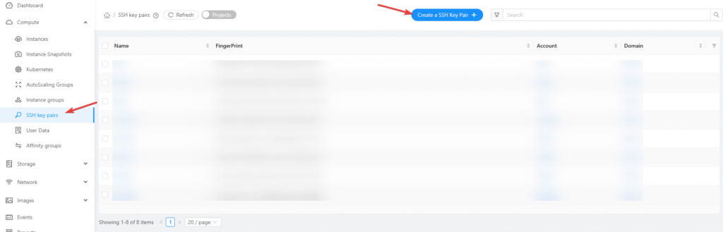 Bước 2: Trong thanh điều hướng bên trái, nhấp vào Compute → SSH Key Pairs.