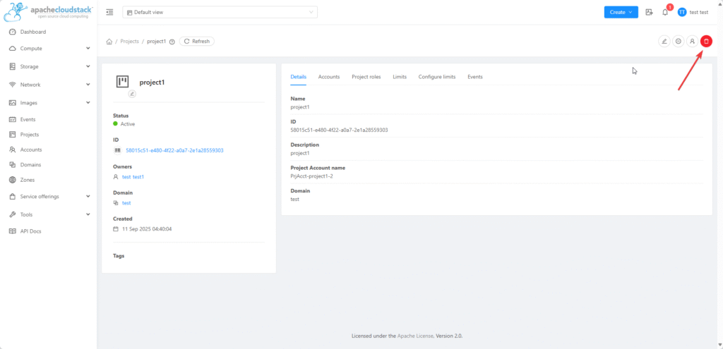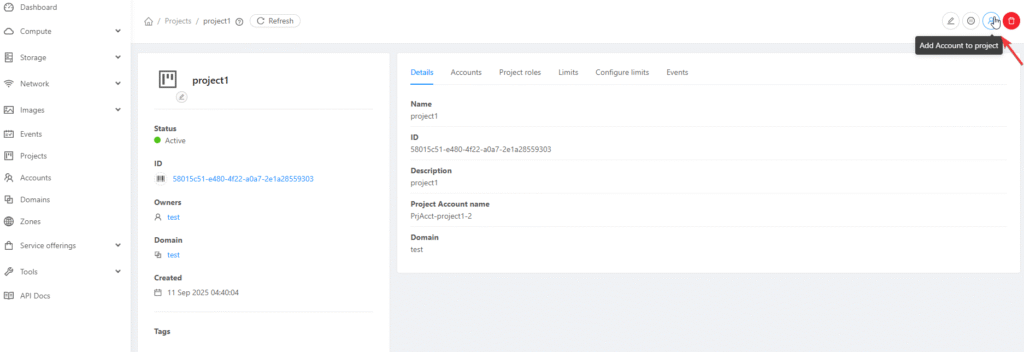 Project là một cách để sắp xếp các account và tài nguyên. Users (accounts) có thể tự nhóm mình thành các dự án để họ có thể chia sẻ các tài nguyên như instances, snapshots, templates, data disks, và địa chỉ IP. Tài nguyên được tạo trong project chỉ thuộc về project đó, không thuộc về account và chỉ được sử dụng trong phạm vi project ấy