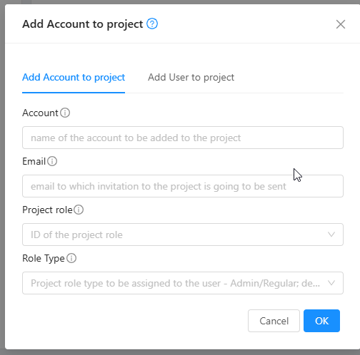 Hộp thoại Add Account to project xuất hiện, Quý Khách có thể thêm user hoặc Account vào để quản trị