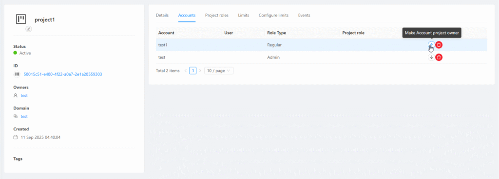 Quý Khách có thể chỉnh quyền sở hữu của project thông qua Role Type, Quý Khách có thể thay đổi chủ sở hữu thông qua Make Account project owner hoặc chọn Remove