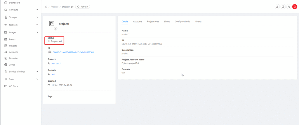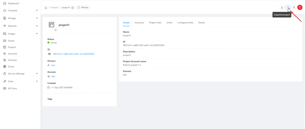 Quý Khách có thể tạm ngưng trạng thái của project. Sau khi bị tạm ngưng, các account (và user) trong dự án sẽ không thể truy cập hoặc sử dụng tài nguyên. Sau khi tạm ngưng, project có thể được kích hoạt lại. Chỉ chủ sở hữu dự án(domain admin) mới có thể tạm ngưng project.