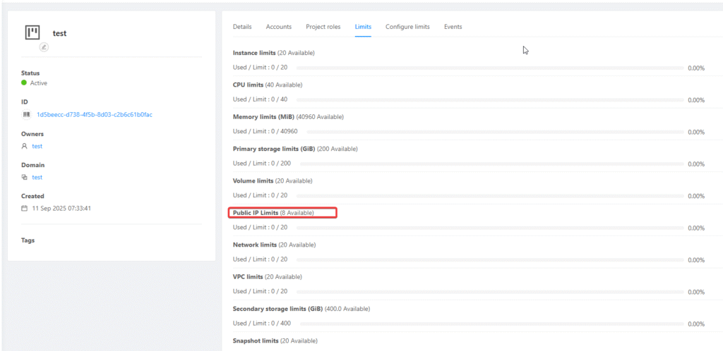 Chọn project muốn thay đổi tài nguyên -> chọn tab Limits xem giới hạn của tài nguyên đó là bao nhiêu để Quý Khách có thể tuỳ chỉnh cho hợp lý. Ví dụ: nếu IP public đang giới hạn là 20 nhưng ở phía kế bên hiển thị là Public IP Limits (8 Available) thì chỉ có thể sử dụng được 8 IP public.