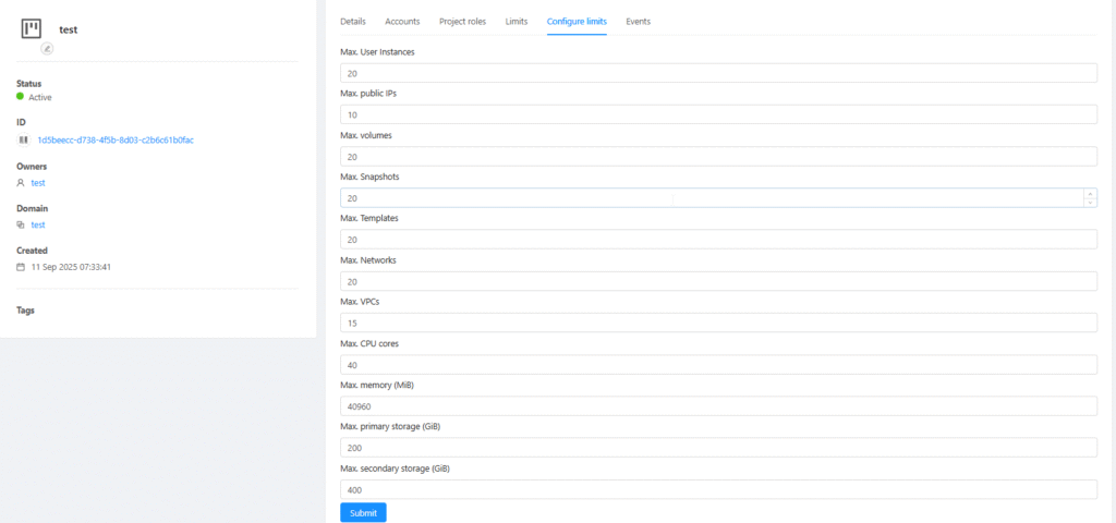 Khi Quý Khách đã xác định được tài nguyên của project -> chọn tab Configure limits để có thể tuy chỉnh tài nguyên theo giới hạn của project -> Submit.