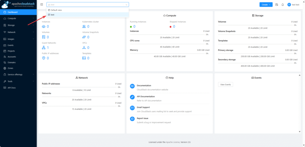 Một account có thể được liên kết với nhiều project. Sau khi đăng nhập, Quý Khách có thể xem các project khác nhau và khi ở chế độ xem project cụ thể, Quý Khách có thể các tài nguyên khi vừa truy cập vào account mà không cần phải vào tab limits trong project để xem. Quý Khách thực hiện theo các bước: Dashboard -> thanh thả xuống như hình -> chọn project muốn xem.