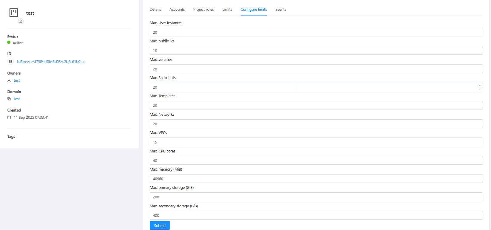 Khi Quý Khách đã xác định được tài nguyên của project -> chọn tab Configure limits để có thể tuy chỉnh tài nguyên theo giới hạn của project -> Submit.