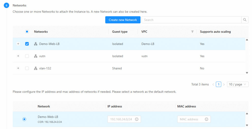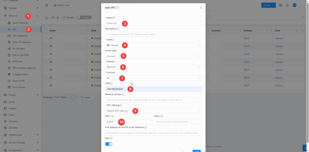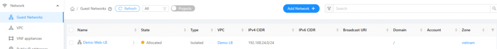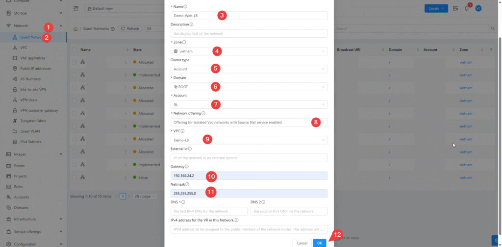 - Phần Network Offering thì mình sẽ chọn: Offering for Isolated VPC networks with Source NAT service enable. Tùy chọn này cho phép tạo mạng VPC dạng cách ly và kích hoạt dịch vụ Source NAT để quản lý lưu lượng truy cập ra ngoài Internet.