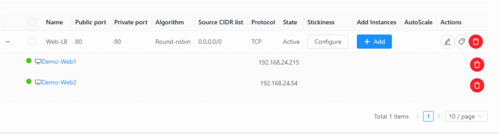 - Algorithm: mình sẽ chọn loại giao thức là Roud-robin ở đây sẽ cân bằng lưu lượng truy cập giữa hai web.