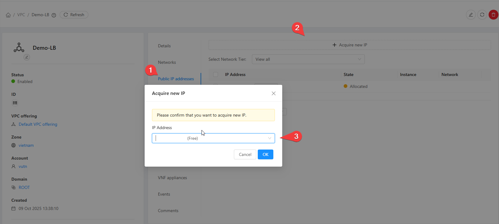 Hiện tại trạng thái State đang là Allocated vì chưa có VM nào sử dụng.