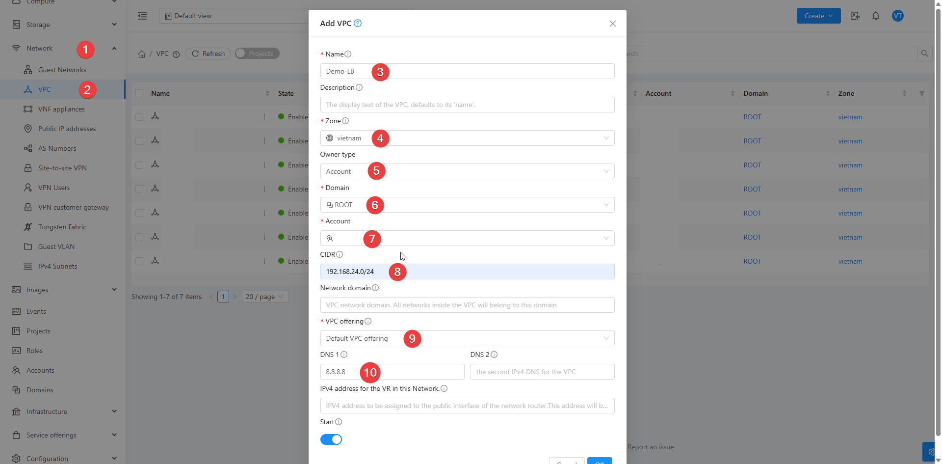 - Phần Network Offering thì mình sẽ chọn: Offering for Isolated VPC networks with Source NAT service enable. Tùy chọn này cho phép tạo mạng VPC dạng cách ly và kích hoạt dịch vụ Source NAT để quản lý lưu lượng truy cập ra ngoài Internet.