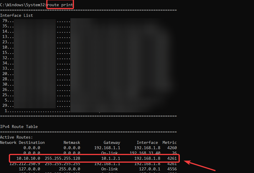 - Quý khách nhập “route print” để kiểm tra xem có route từ 10.10.10.0 đến gateway là 10.1.2.1 hay chưa. Nếu chưa có quý khách vui lòng thêm vào bằng lệnh: