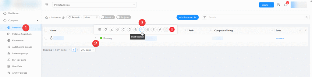 Truy cập vào trang quản lý dịch vụ của Quý Khách -> Chọn Instaces -> Chọn vào VM muốn backup: