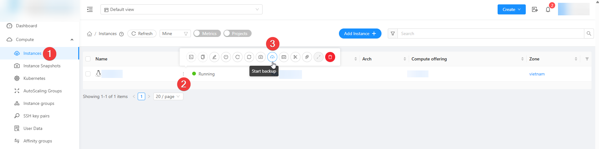 Truy cập vào trang quản lý dịch vụ của Quý Khách -> Chọn Instaces -> Chọn vào VM muốn backup:
