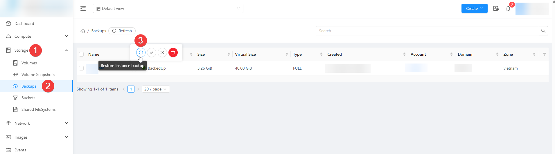 Sau khi Backup xong, Quý Khách có thể kiểm tra Backup tại phần Storage -> Backups, sau đó chọn vào bản Backup cần để Restore lại
