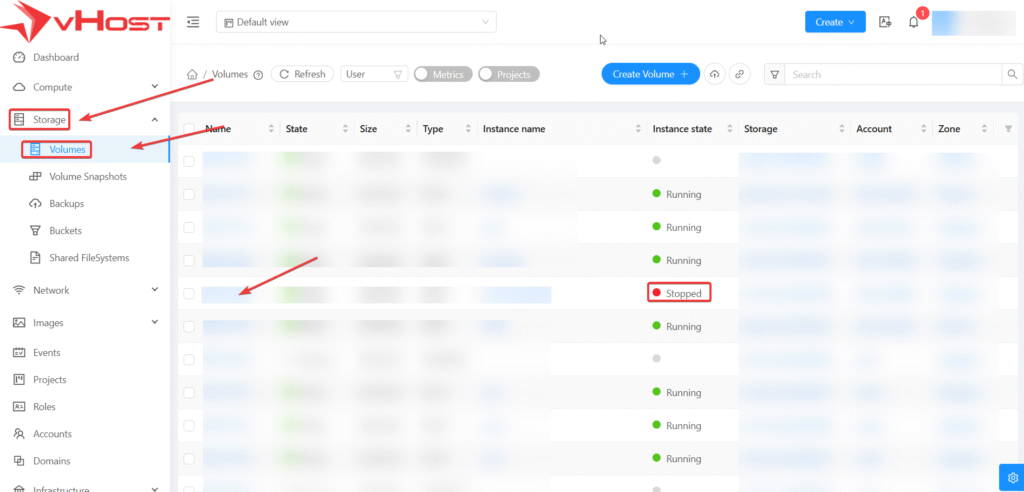 - Bước 2: Chọn Storage ở Menu bên trái sau đó chọn Volume
