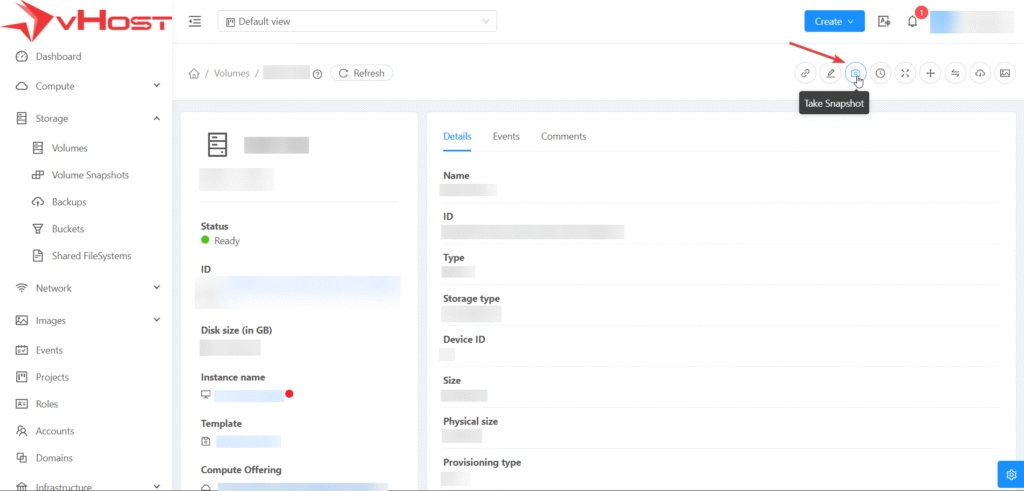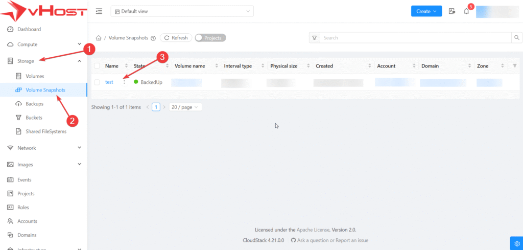 - Bước 3: Chọn vào Volume cần Snapshot