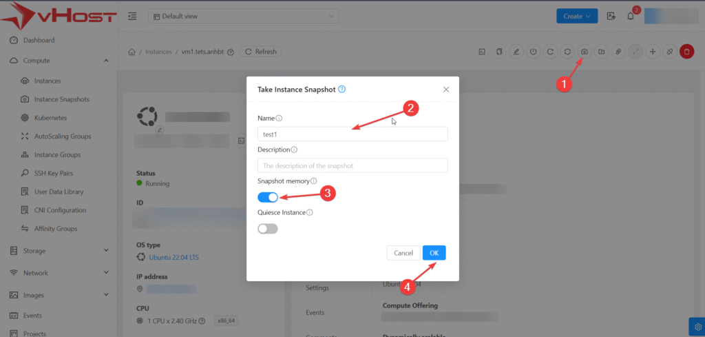 Khác với Disk Snapshot, VM Snapshot không yêu cầu phải stop Instance mà có thể thực hiện trực tiếp trong khi VM ở trạng thái Running