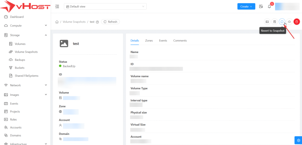- Bước 2: Chọn Volume snapshot cần revert
