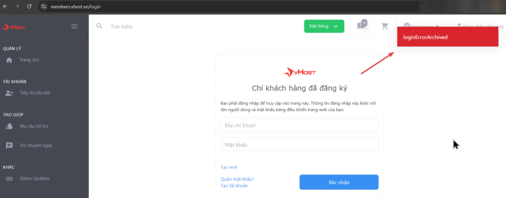 - Không thể đăng nhập vào hệ thống quản lý dịch vụ tại https://members.vhost.vn