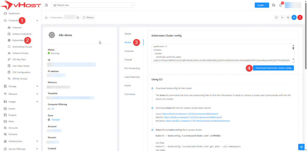 Sau khi cụm được khởi tạo và trạng thái khi đã Running, Quý Khách bấm vào Cụm mới được khởi tạo, chọn Access, sau đó chọn Download Kubernets cluster config là đã có thể tải về được.