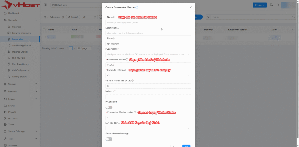 Trước khi tạo cụm Kubernetes đầu tiên, Quý Khách cần lưu ý thêm SSH Key vào để sau khi cụm được khởi tạo là có thể SSH vào ngay các Worker Nodes. Chi tiết vHost hướng dẫn tại đây:
