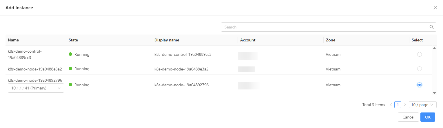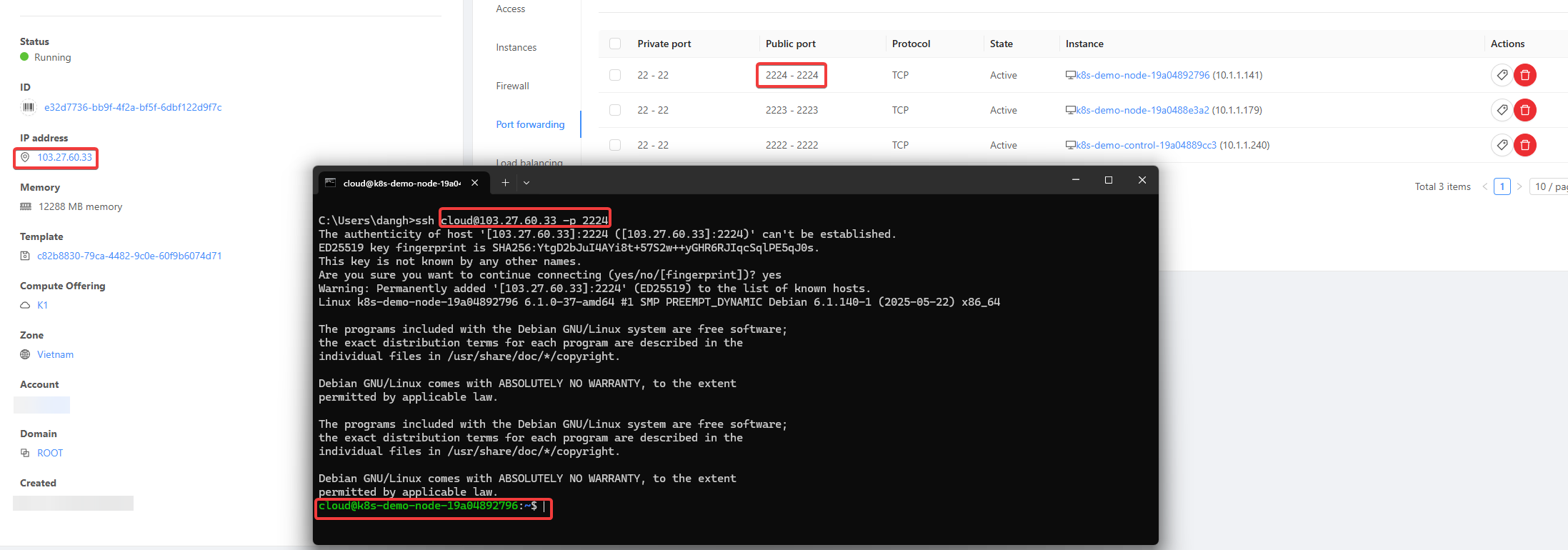 Sau khi cấu hình Port forwarding, Quý khách đã có thể truy cập vào Instance trong cụm Kubernetes của mình bằng IP Public và Port forwarding.