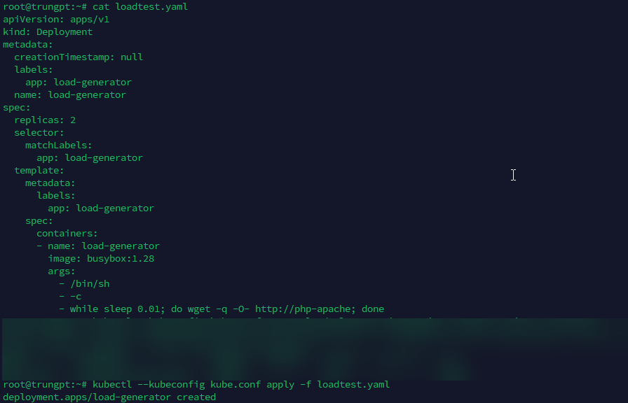 vHost sẽ tạo và chạy file loadtest.yaml để tạo lưu lượng HTTP request liên tục đến php-apache.