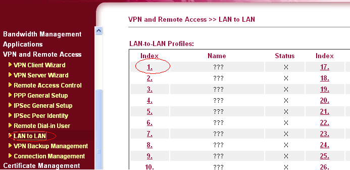 Quý Khách đăng nhập vào giao diện quản lý trên thiết bị DrayTek và chọn vào mục VPN and Remote Access > LAN to LAN và chọn Index 1.