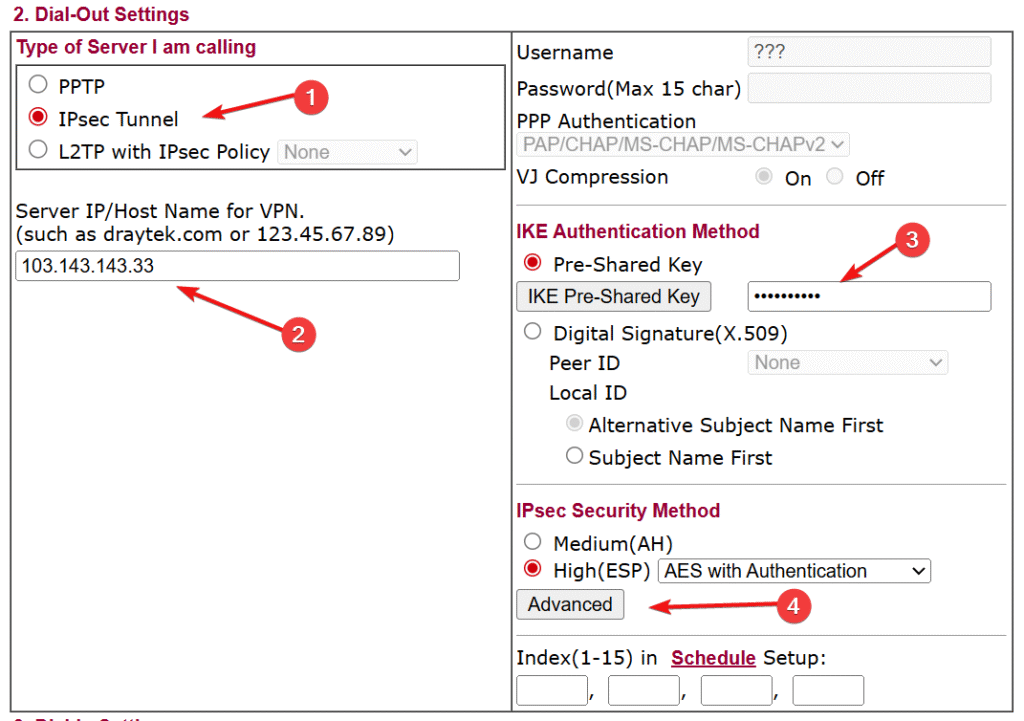 - Ở mục IPsec Security Method, chọn High(ESP) > Advanced để cấu hình chi tiết phương thức mã hóa giữa 2 bên.