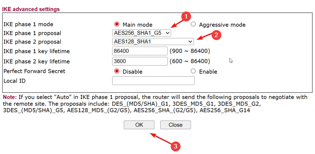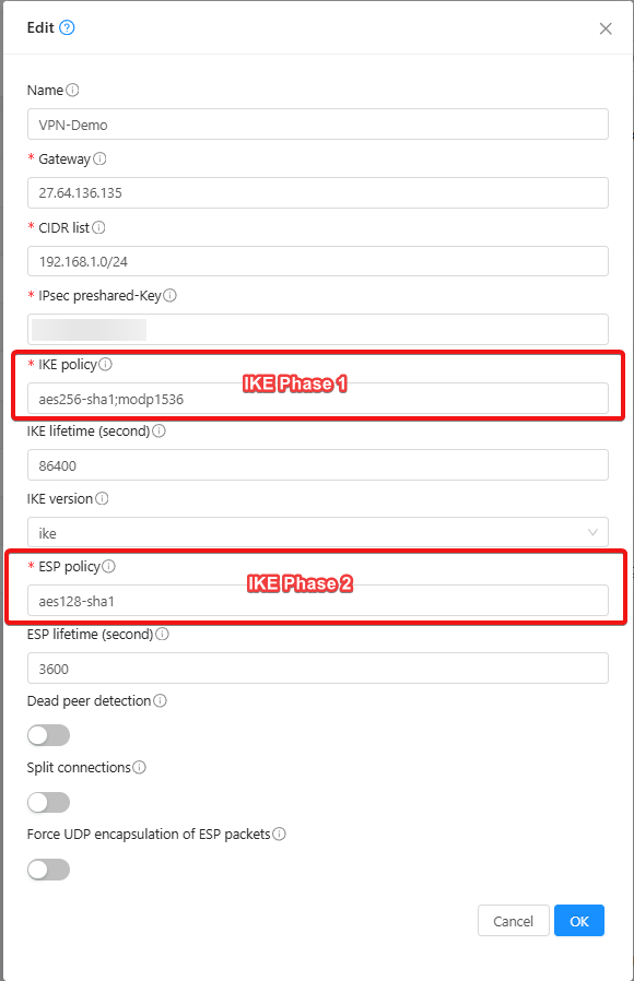 Quý Khách cần đảm bảo thuật toán IKE phase 1 và phase 2 đồng bộ giữa 2 bên. Sau khi cấu hình xong chọn OK
