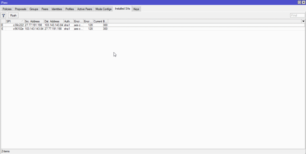Quý Khách có thể vào IP->IPsec->Installed SAs để xem 2 Site khi đã kết nối chưa, như hình 2 Site đã kết nối thành công.